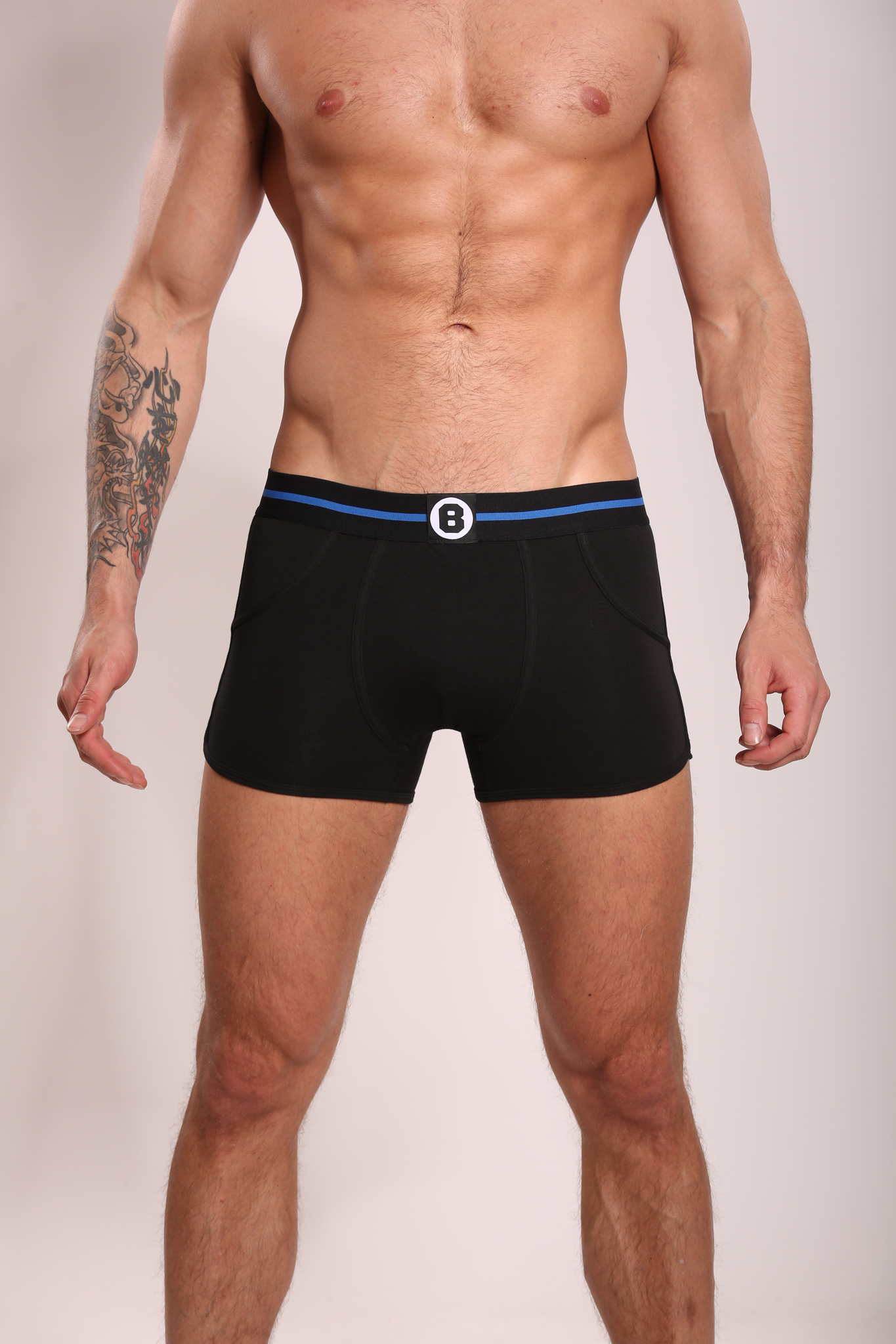 - Farbe: Schwarz einfarbig mit einem blauen Streifen im Bund.